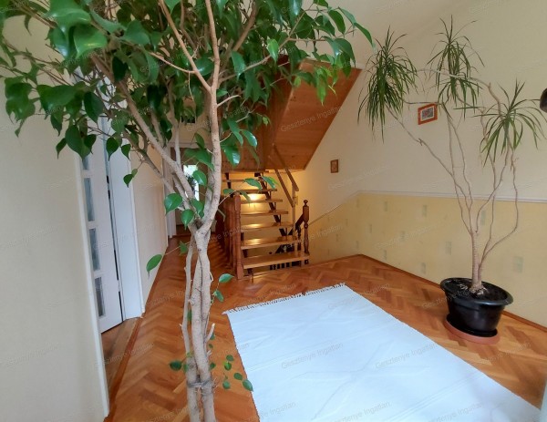 Az 1988-ban téglából épült háromszintes családi ház földszintjén egy tágas, világos amerikai konyhás nappali, fürdőszoba illemhellyel együtt, előszoba, közlekedő, kazánház, egy garázs és egy a nappaliból nyíló fedett terasz került kialakításra. A ház első emeletén három tágas szoba, egy tágas fürdőszoba illemhellyel együtt, közlekedő és minden szobából nyíló erkély található. A tetőtéri szint két tágas helyiségből és egy közlekedőből áll. A ház fűtésére gázkazán szolgál, a meleg vizet az alsó szinten elektromos vízmelegítő, a felső szinten gázos átfolyós vízmelegítő biztosítja. Az alsó szint klimatizált, amelyhez H tarifás mérő lett kialakítva. Az ingatlan egy 445m2-es telken helyezkedik el, a főút felőli részen a garázs előtt egy tágas autóbeálló és örökzöldek, a ház mögötti 262m2-en egy csendes, dísznövényekkel tarkított, kikapcsolódásra, pihenésre kiválóan alkalmas kert található.